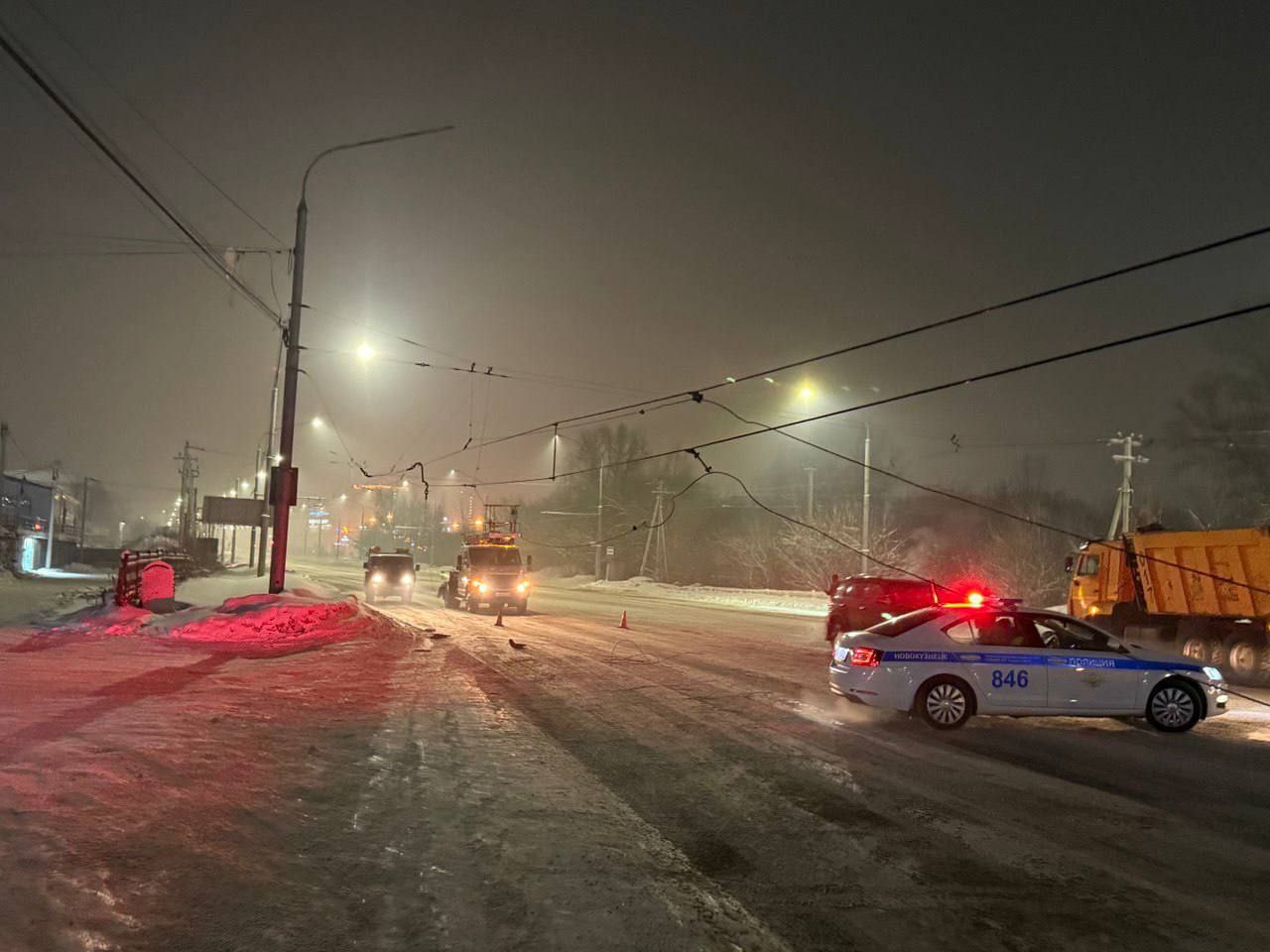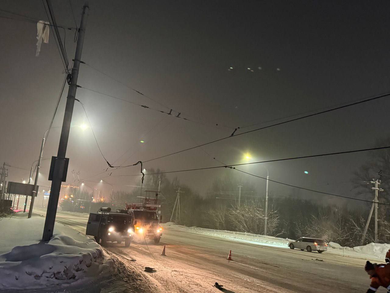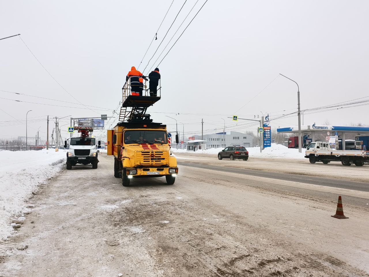 Специалисты службы "Сети и подстанции" Муниципального трамвайно-троллейбусного предприятия прилагают все усилия для восстановления контактной сети.