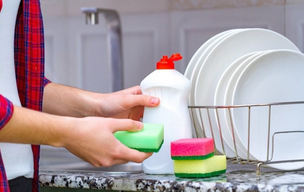 - Используйте средства правильно: Не перебарщивайте с моющим средством. Нанесите немного средства на губку, а не на саму посуду.