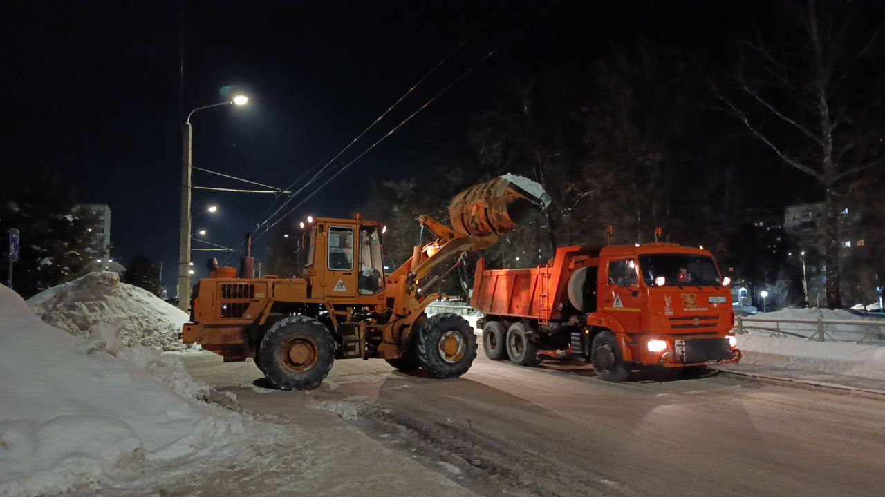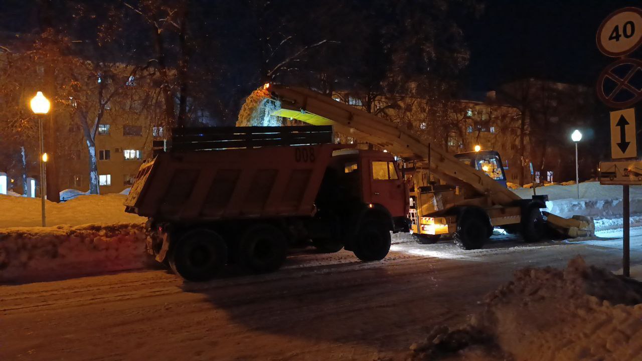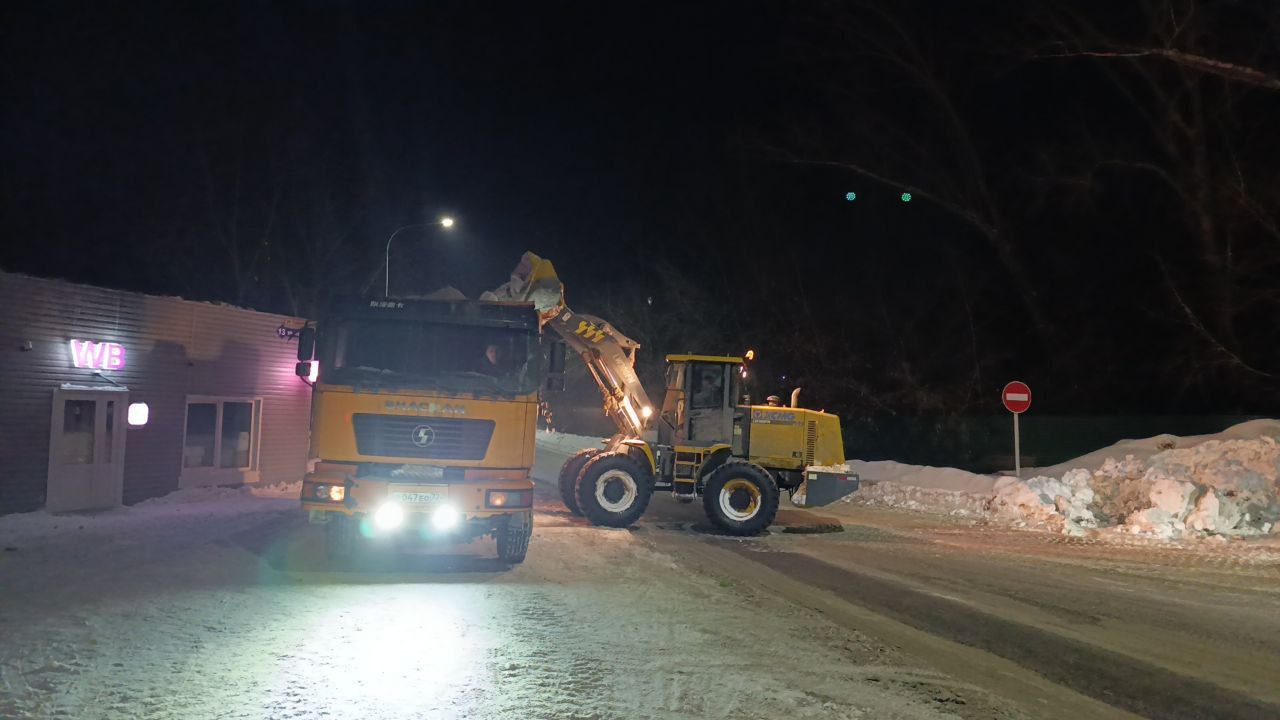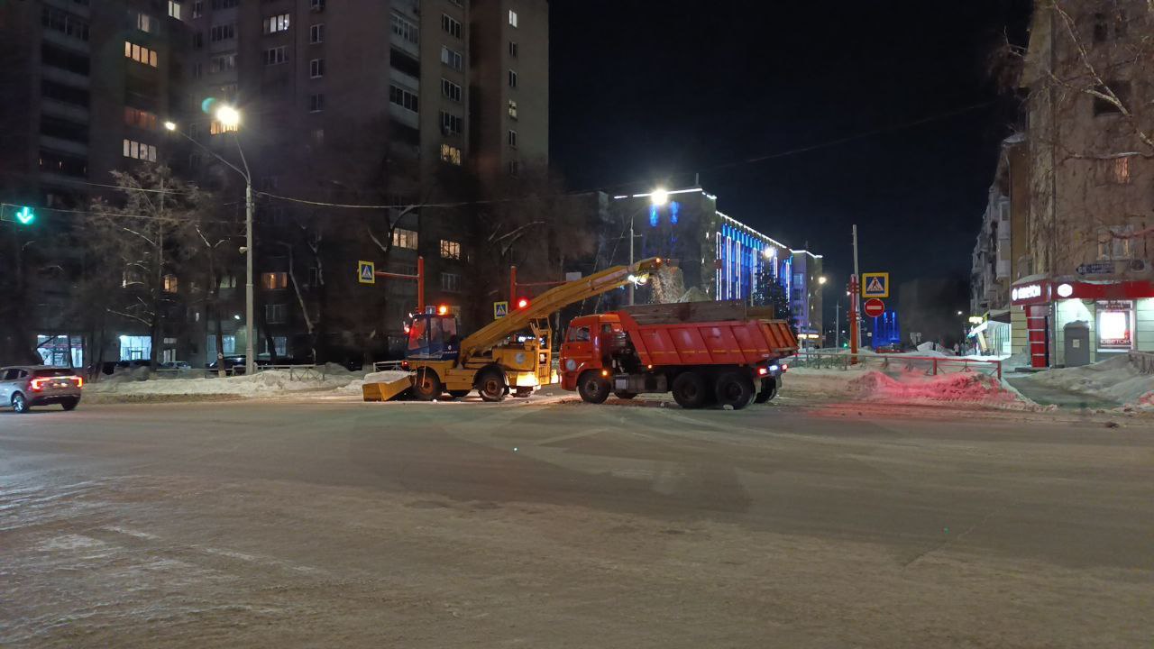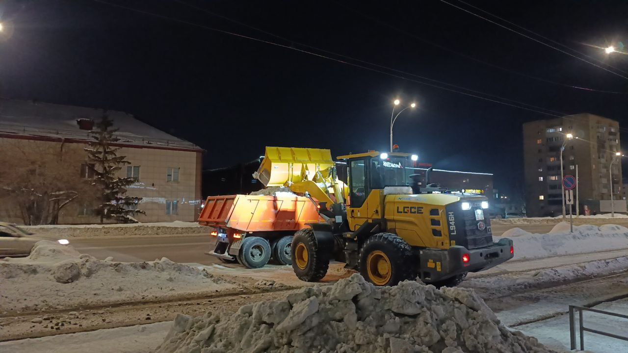 В Кемерове в ночную смену дорожники вывозили снег с Логового шоссе, пересечения улиц Суворова и Рутгерса, а также с улицы Сибиряков-Гвардейцев