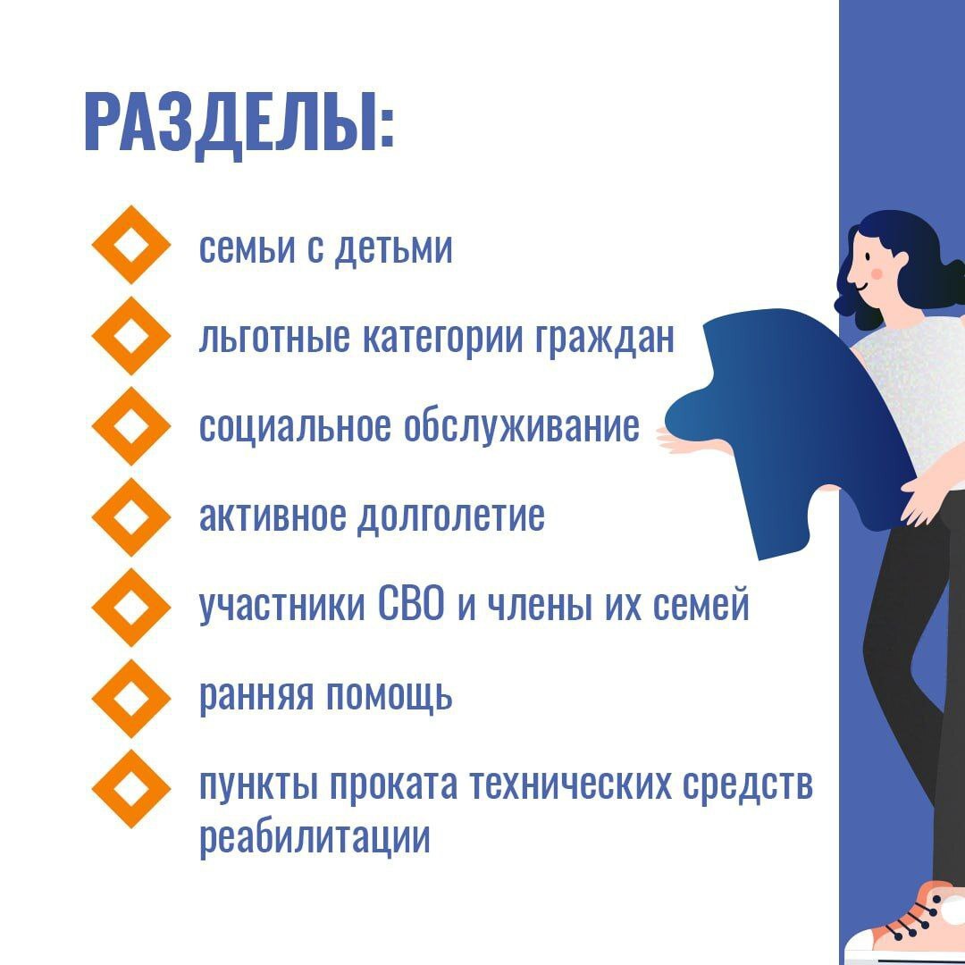 На платформе размещены разделы с информацией о мерах социальной поддержки для инвалидов, ветеранов труда и боевых действий, членов их семей, участников СВО, реабилитированных лиц и других категорий граждан.