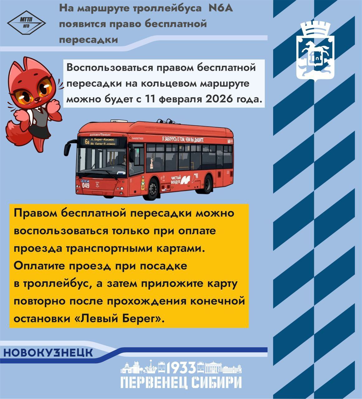 В связи с увеличившимся количеством обращений по вопросу необходимости повторной оплаты проезда при прохождении конечного остановочного пункта Левый берег маршрута троллейбуса 6А (Левый берег Вокзал Левый берег) Муниципальным трамвайно-троллейбусным предприятием Новокузнецкого городского округа принято решение о введении на данном маршруте права бесплатной пересадки для пользователей транспортных карт. Изменения вступят в силу с 11 февраля 2026 года.