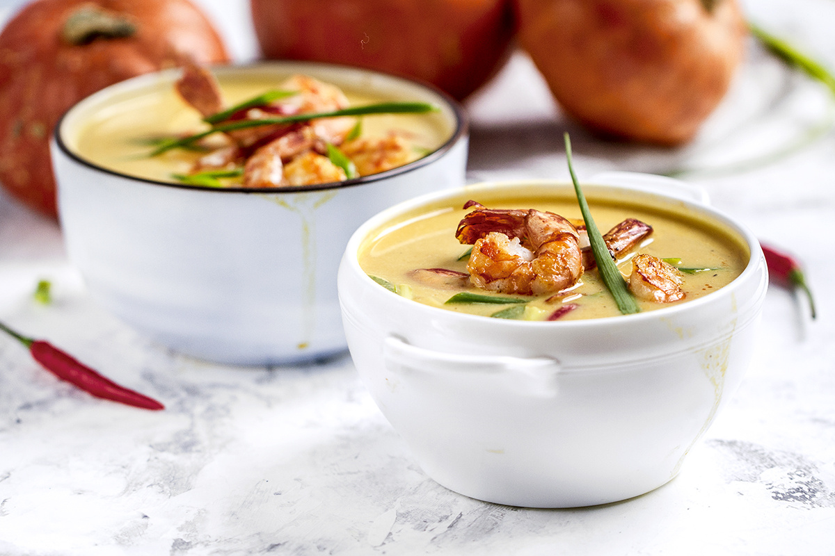 Спокойное наблюдение за тыквенным крем-супом с креветками в кокосовом молоке