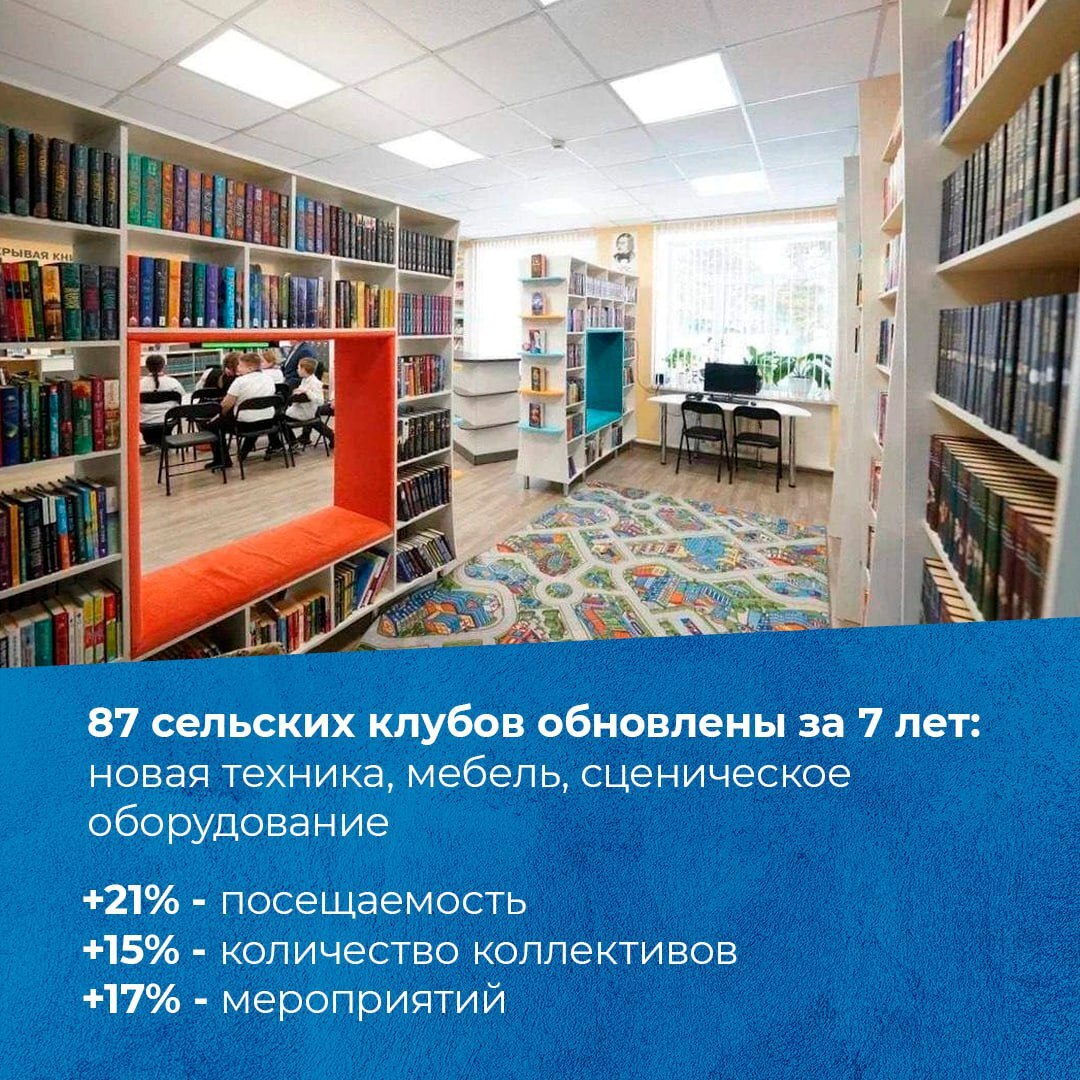 За семь лет благодаря проекту «Культура малой Родины» модернизированы 87 сельских клубов: закуплены звуковое и световое оборудование, мебель, музыкальные инструменты и выставочные комплекты.