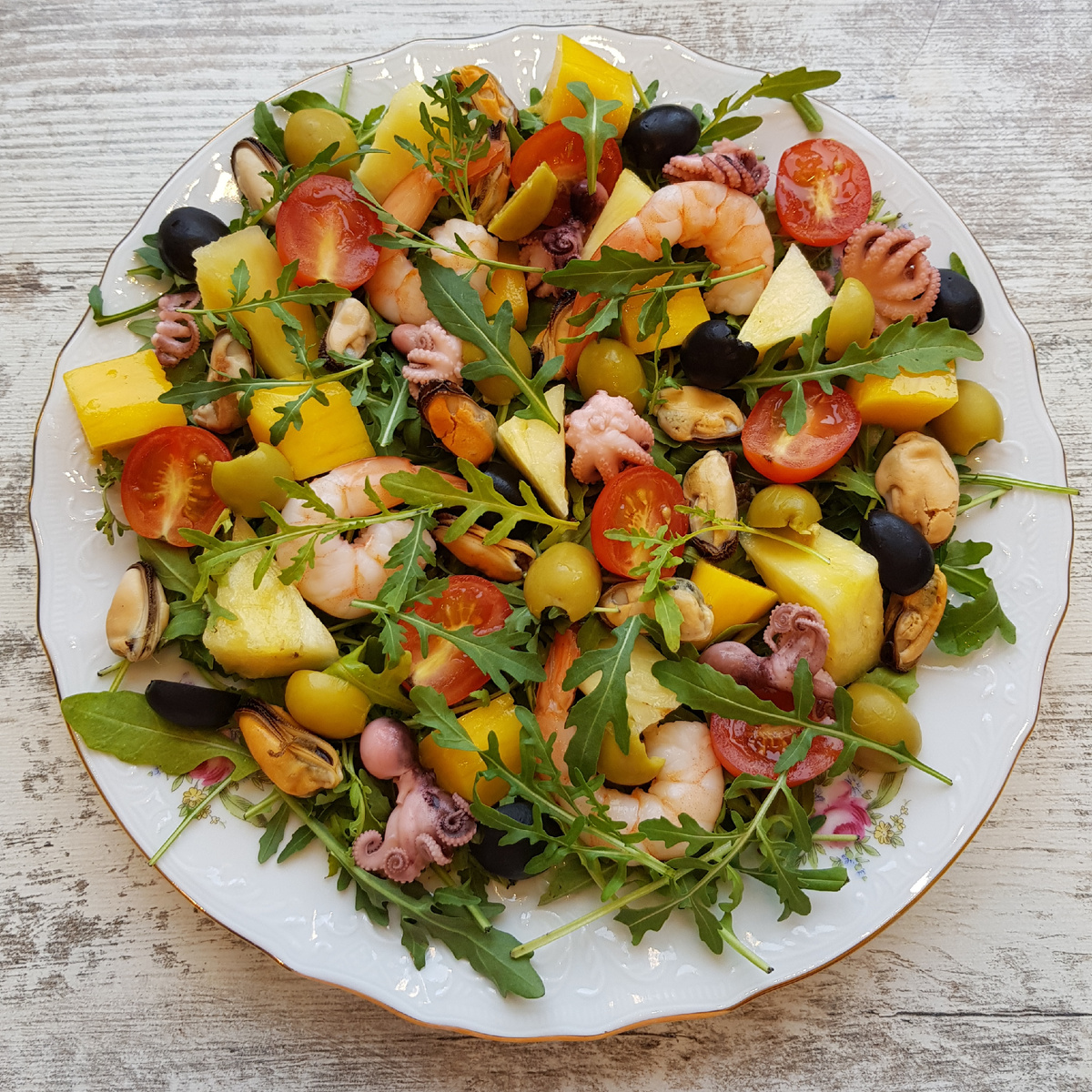 4. Добавьте на тарелку мидии, креветки и осьминогов — они придадут салату морской вкус.
