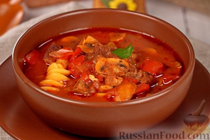 - Бограч с грибами и макаронами: венгерский суп, насыщенный вкусом мяса, овощей и обилием паприки, в этом варианте дополнен шампиньонами и макаронами, что делает его густым и сытным.