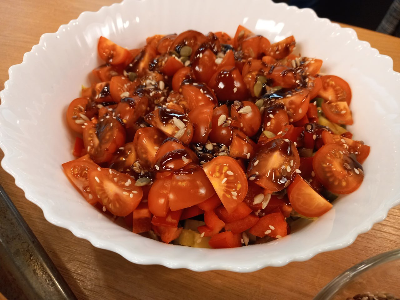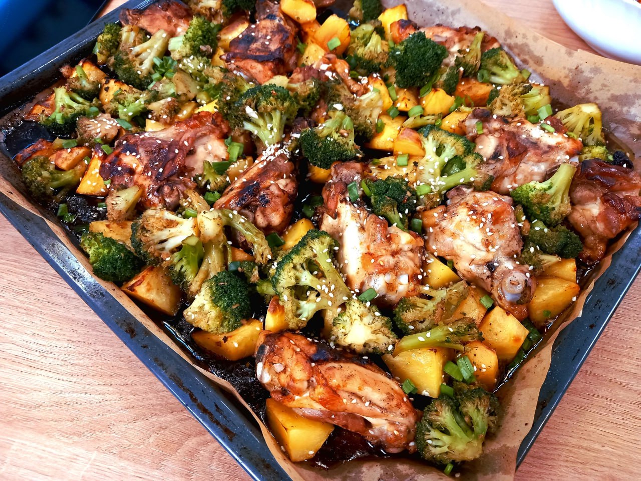 2. На второе у нас - салат «Нежный» и запечённые куриные бёдра с картошкой и брокколи в соевом соусе.