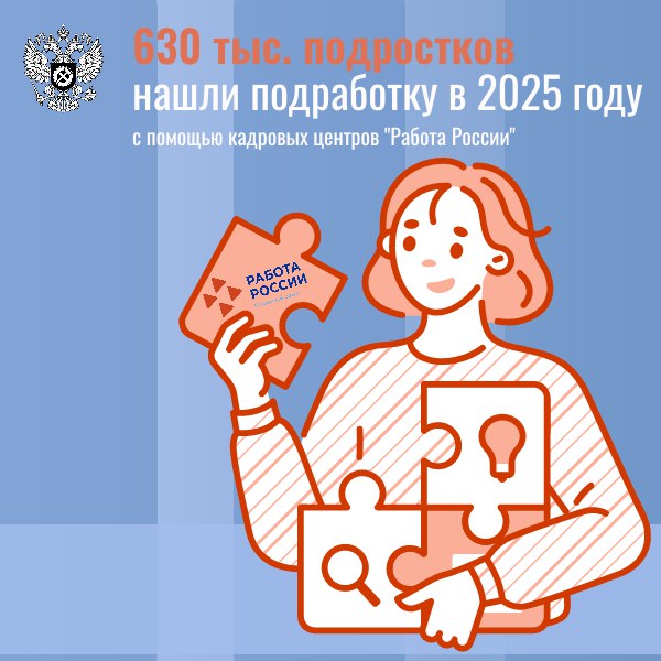В 2025 году благодаря центрам занятости «Работа России» более 630 000 подростков от 14 до 18 лет нашли себе подработку в свободное от учёбы время.