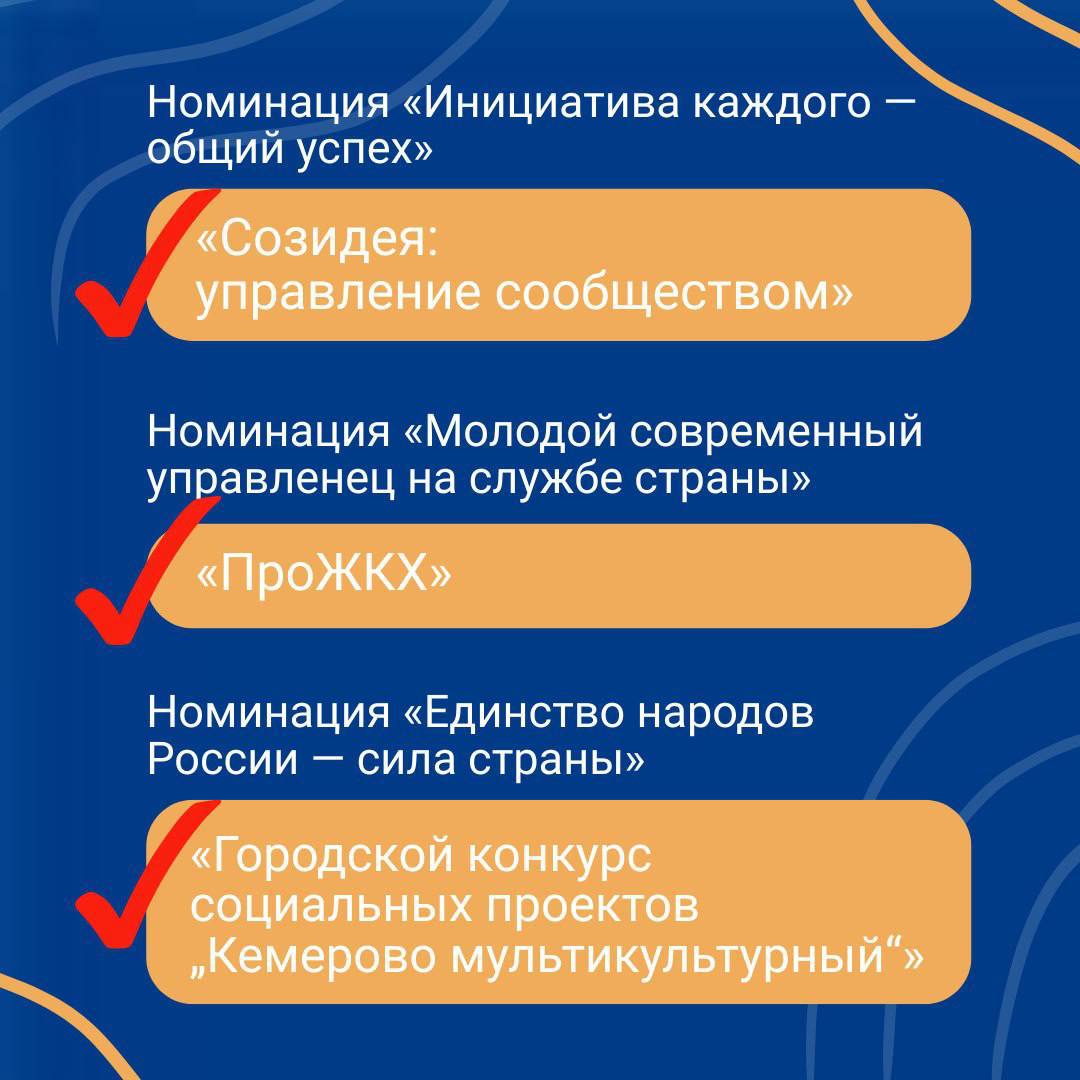 Кемерово представляет проект «Созидея: управление сообществом» в номинации «Инициатива каждого — общий успех». Новокузнецк вошёл в борьбу с проектом «ПроЖКХ» в номинации «Молодой современный управленец на службе страны». В номинации «Единство народов России — сила страны» заявлен проект «Городской конкурс социальных проектов „Кемерово мультикультурный“».