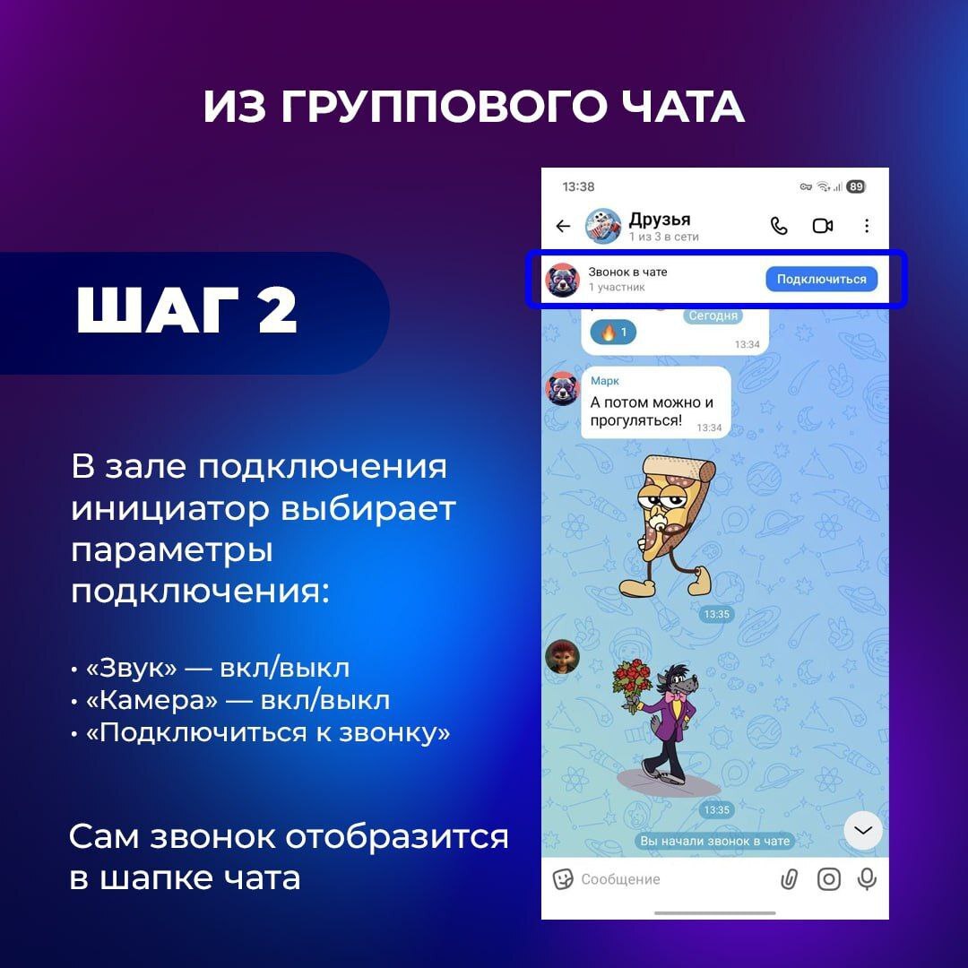 В мессенджере можно организовать аудиозвонок или видеоконференцию с несколькими участниками прямо из чата или через меню звонков.