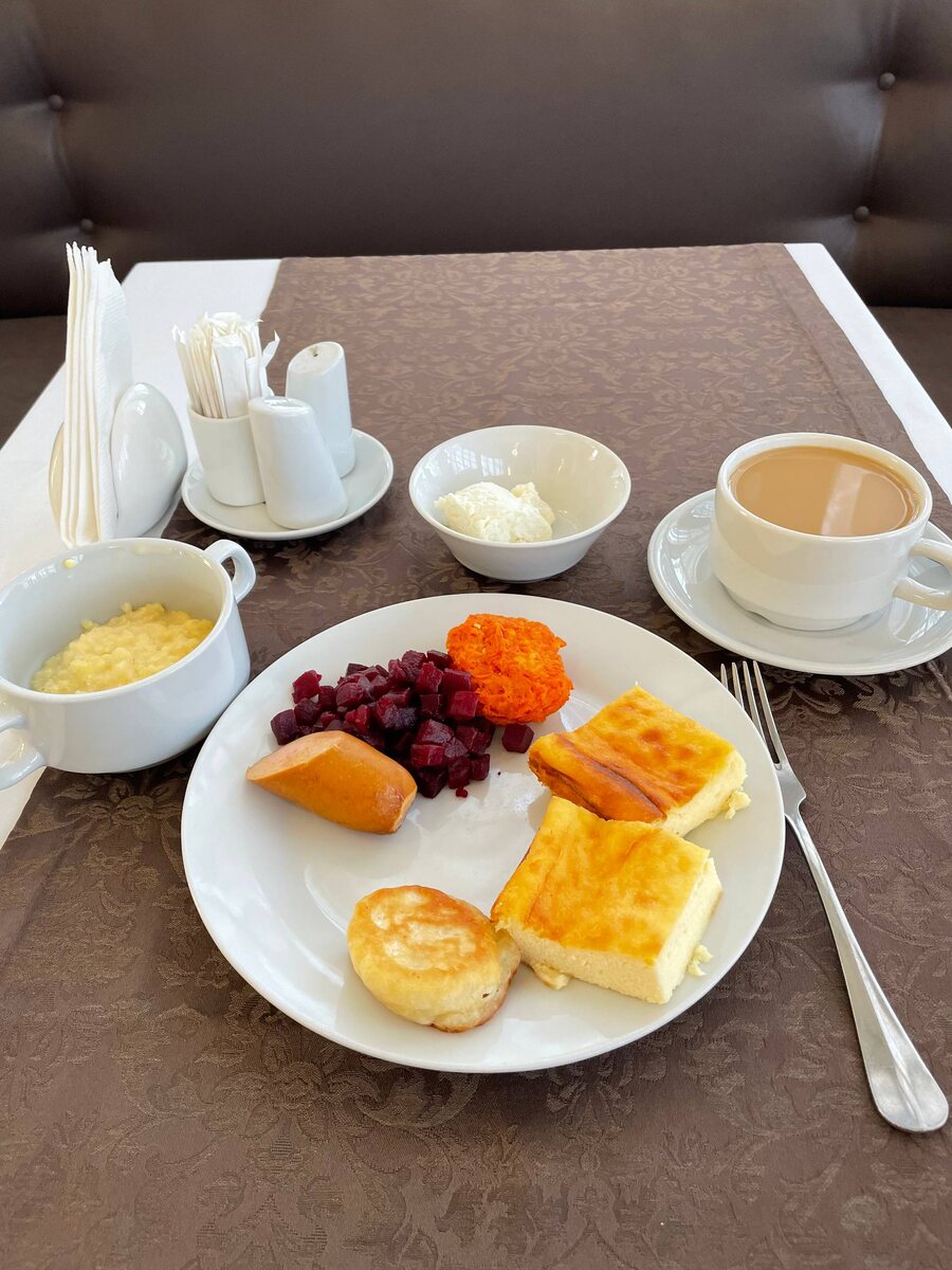 Утро началось с аппетитного выбора на завтрак: два кусочка запеченного творога, румяный оладушек, сарделька, морковная котлета, свекла, пшенная каша (которую не удалось съесть до конца) и творог с изысканной добавкой. А также чашка кофе с молоком и теплый чай с ложечкой вишневого варенья, который добавил нотку сладости в утренний ритуал.