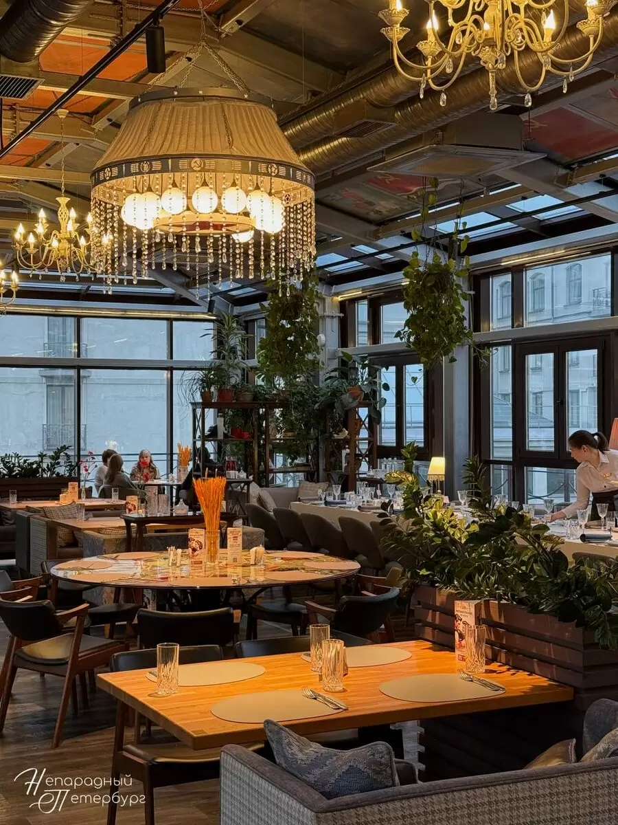 Интерьер ресторана «Союз» гармонично сочетает в себе современные дизайнерские решения и элементы ретро, создавая атмосферу, напоминающую о Советском прошлом. Панорамные окна и зеленые растения делают обстановку еще более уютной.