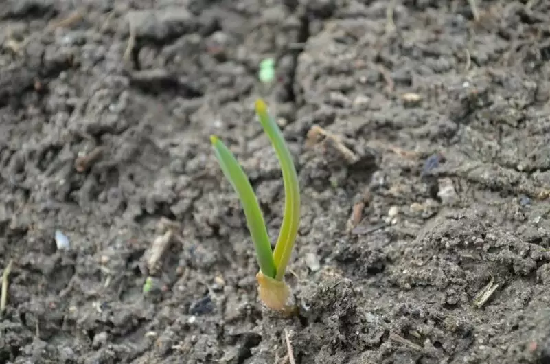 С приходом весны на поверхности почвы нередко образуется плотная корка, которая затрудняет всходы. Чтобы помочь чесноку прорастать, необходимо рыхлить почву на грядках.