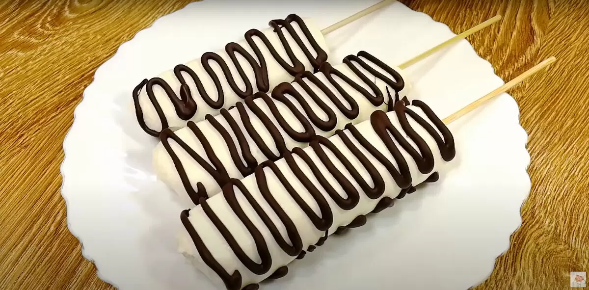 Пока заготовки охлаждаются, шоколад необходимо растопить. Это можно сделать, поместив его в пакет и опустив в горячую воду для плавления. Как только шоколад станет жидким, его можно использовать для украшения десертов. Каждый ‘эскимо’ нужно аккуратно нанизать на деревянную шпажку и обмакнуть в шоколад. А для разнообразия можно создавать узоры, отсекая уголок у пакетика с растопленным шоколадом.