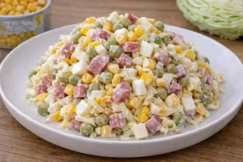 4. В миску добавьте все ингредиенты: капусту, кукурузу, горошек, яйца и колбасу. Аккуратно перемешайте.