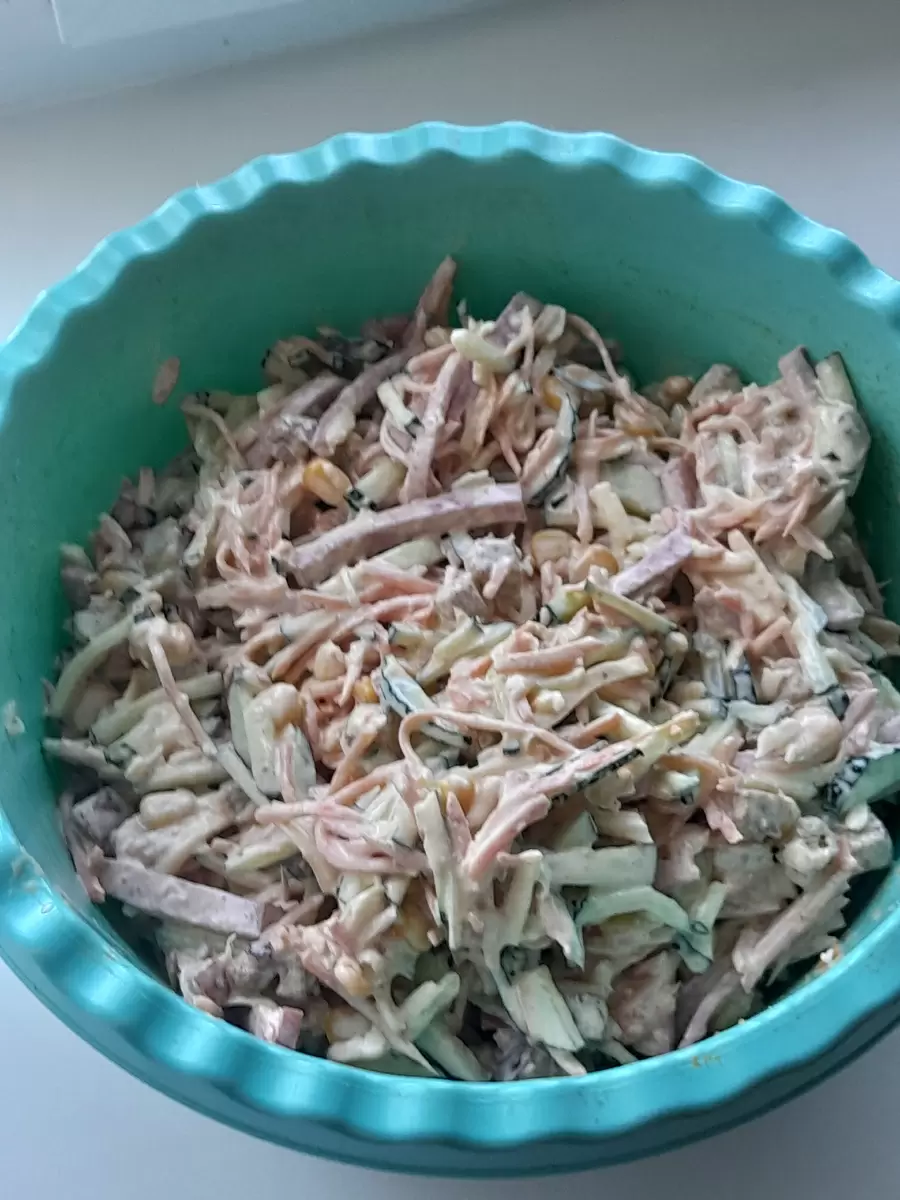 В этом блюде гармонично сочетаются нежная колбаса, свежие огурцы и сладкая консервированная кукуруза, которые придают салату яркость и текстуру. Не забывайте о ароматных сухариках, которые добавят необходимый хруст, делая каждый кусочек особенным. Майонезная заправка объединяет все компоненты, придавая им насыщенный вкус, а свежая зелень вносит нотку легкости и свежести.