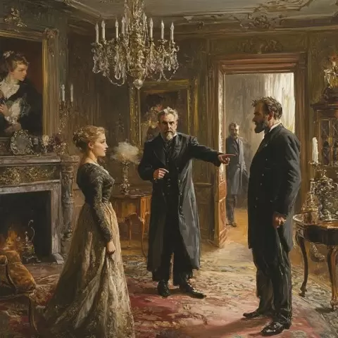 Александра Барышева, пережившая непростые времена, стоит у окна своей роскошной гостиной, уставившись в холодный замерзший сад. Её строгая прическа и светло-серое платье с кружевами, хоть и были эффектными, не скрывали внутренней борьбы. Волнение насчет своего положения в обществе, где царят сплетни и осуждения, постоянно сопровождает её.