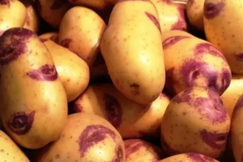 - На каждом кусте формируется от 15 до 20 клубней, которые имеют овальную форму и желтую поверхность с фиолетовыми пятнышками вокруг глазков.