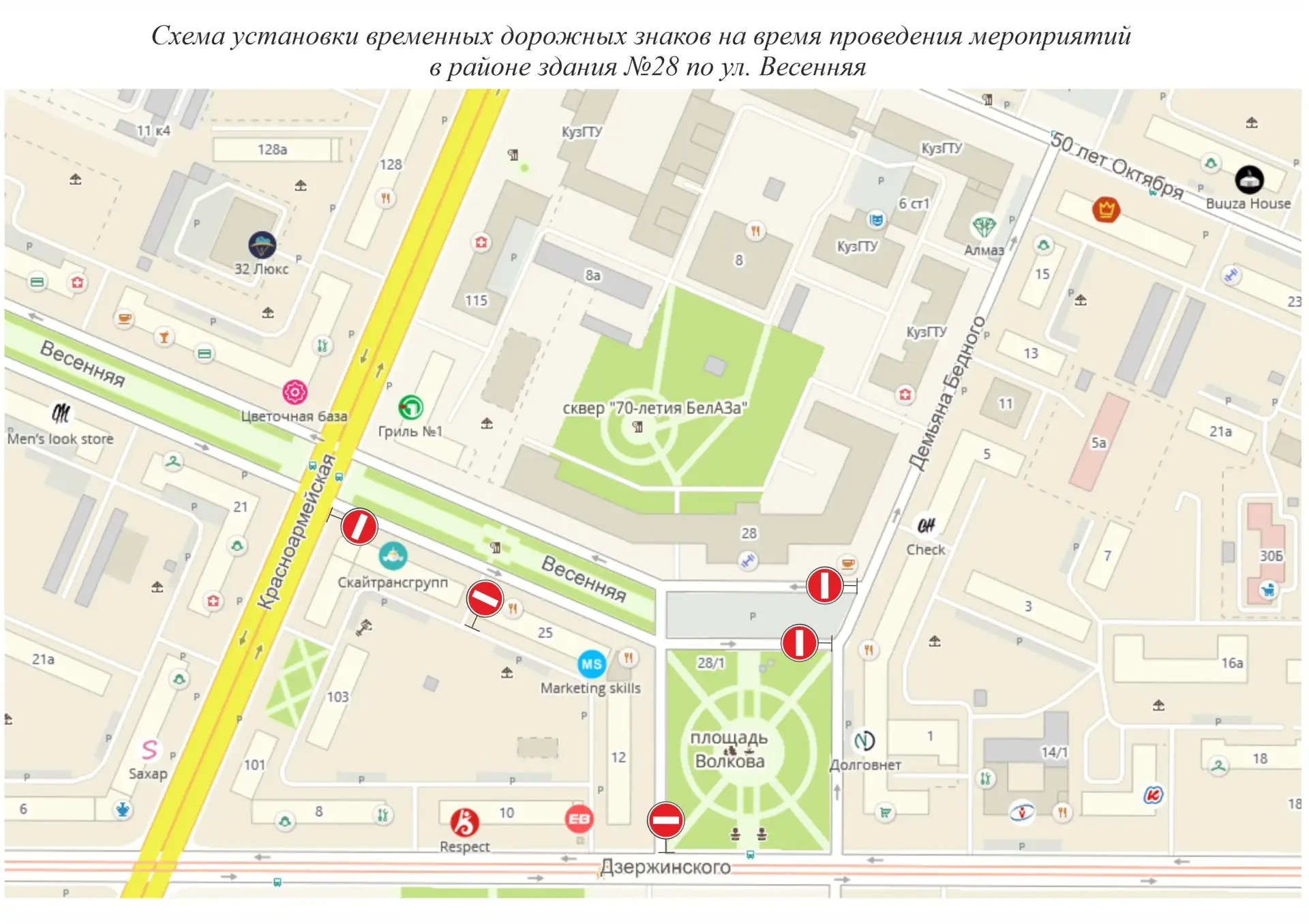 С 07.00 до 14.30 29 апреля закроют движение по ул. Весенняя от ул. Красноармейская до ул. Демьяна Бедного, дороге у площади Волкова и на парковке у здания №28 по ул. Весенняя.