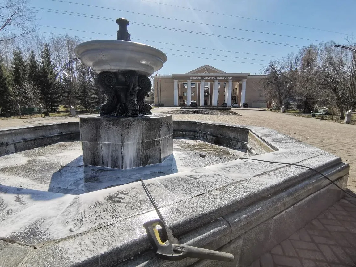 Прямо сейчас приводят в порядок фонтан в сквере около ДК шахтёров.