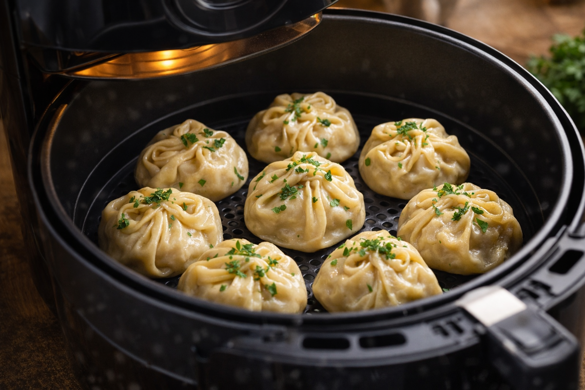 Подготовка мантов начинается с разогрева аэрогриля до 180 градусов. Затем манты аккуратно смазываются растительным маслом и слегка сбрызгиваются водой. Это нужно для того, чтобы тесто не пересохло и равномерно подрумянилось.